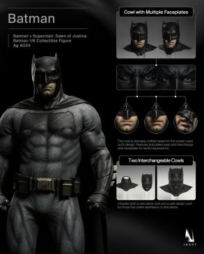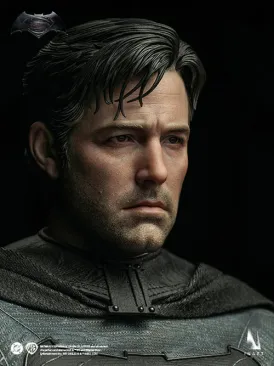 This lifelike head sculpt features detailed skin textures, stubble, and wrinkles, capturing the world-weary Bruce Wayne as portrayed by Ben Affleck. Includes modular hair pieces that can be swapped out for different looks.Cowl with Multiple Faceplates