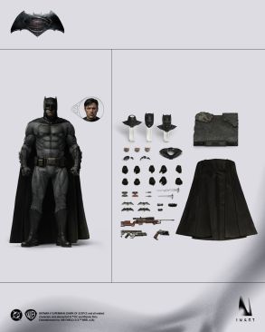 Photos and details have been released by Queen Studios for their upcoming Batman v Superman: Dawn of Justice – Inart Batman 1/6 Scale Figure. This highly detailed figure will features masked and unmasked portraits, interchangeable hair pieces, interchangeable cowl pieces, multiple lower jaws, an assortment of swap out hands, a wired cape, diecast metal batarangs, a branding batarang, a grenade launcher, and more.